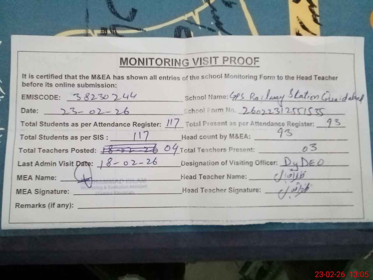 | Remarks (Use Separate Page if Required): Dy DEO visited school on 18 February 2026 students strength on sis 117 | |||||
