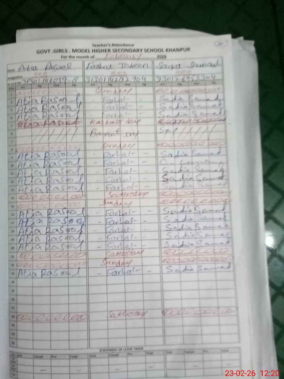| CNIC | Full Name | Designation | R/C | Absence During Last Calender Month |