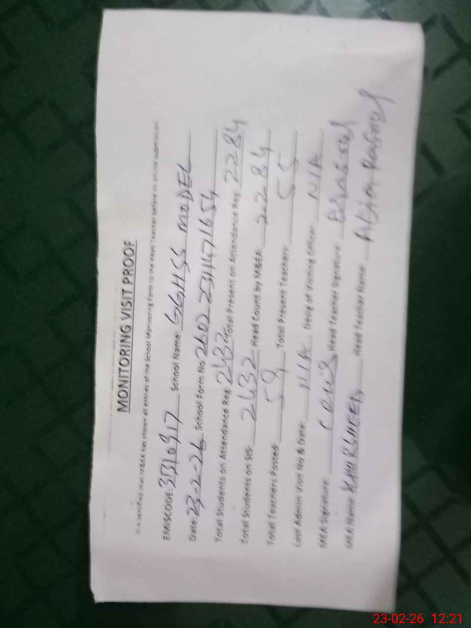 | Attendance Register | Head Teacher | MEA with School | Visit Proof |
