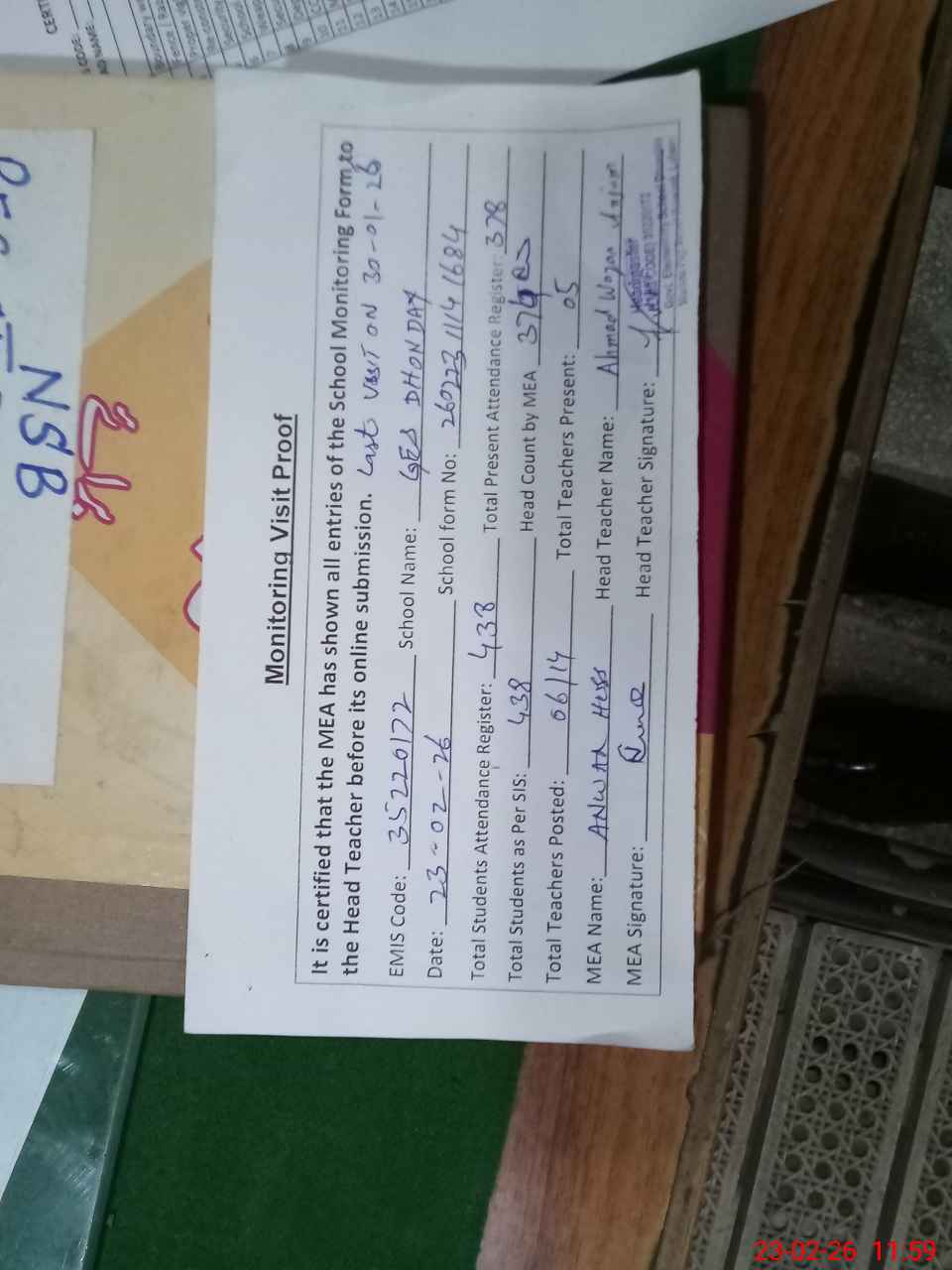 | Remarks (Use Separate Page if Required): Last visit AEO on 30 January 2026 01 wash room under construction All building required white wash Teacher very less only 06 Teacher including Heed Teacher for 09 classes | |||||