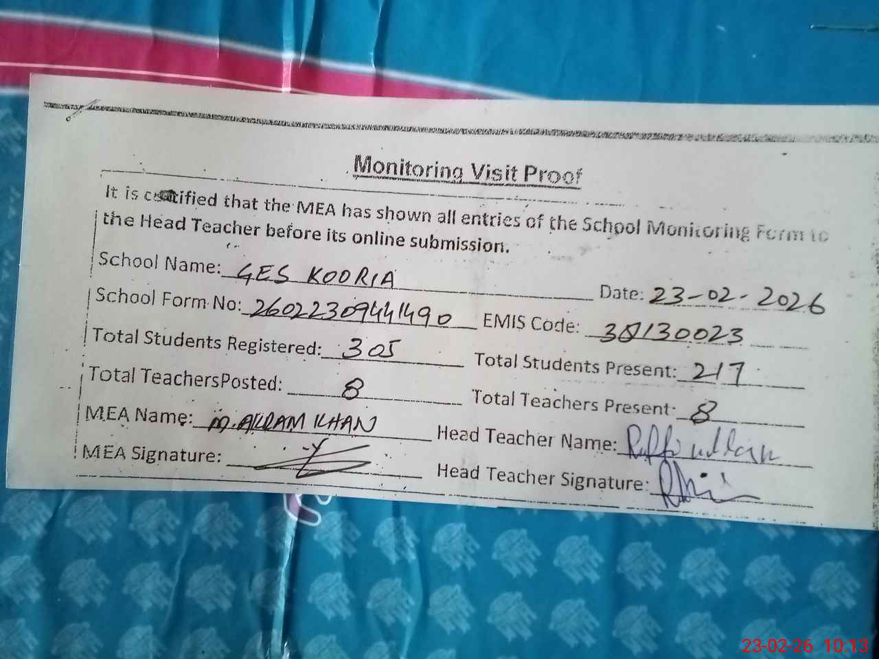 | Attendance Register | Head Teacher | MEA with School | Visit Proof |