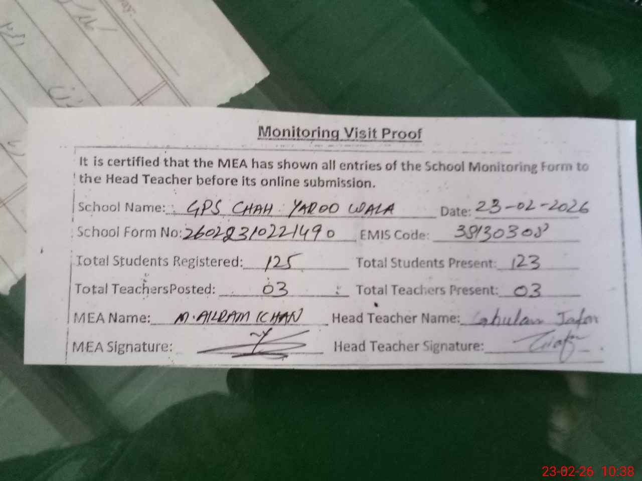 | EMIS Code: 38130308 | Name of School: GPS CHAH YAROO WALA | |||