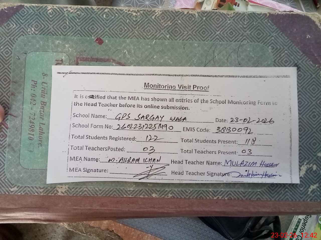 | Attendance Register | Head Teacher | MEA with School | Visit Proof |