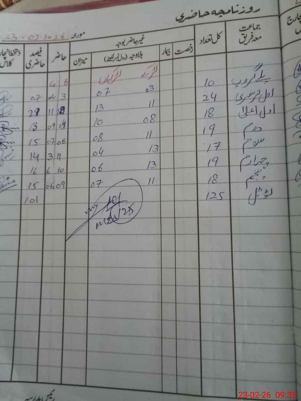 | Total Students Present | 0 | 7 | 13 | 15 | 15 | 16 | 15 | 101 | ||||||||