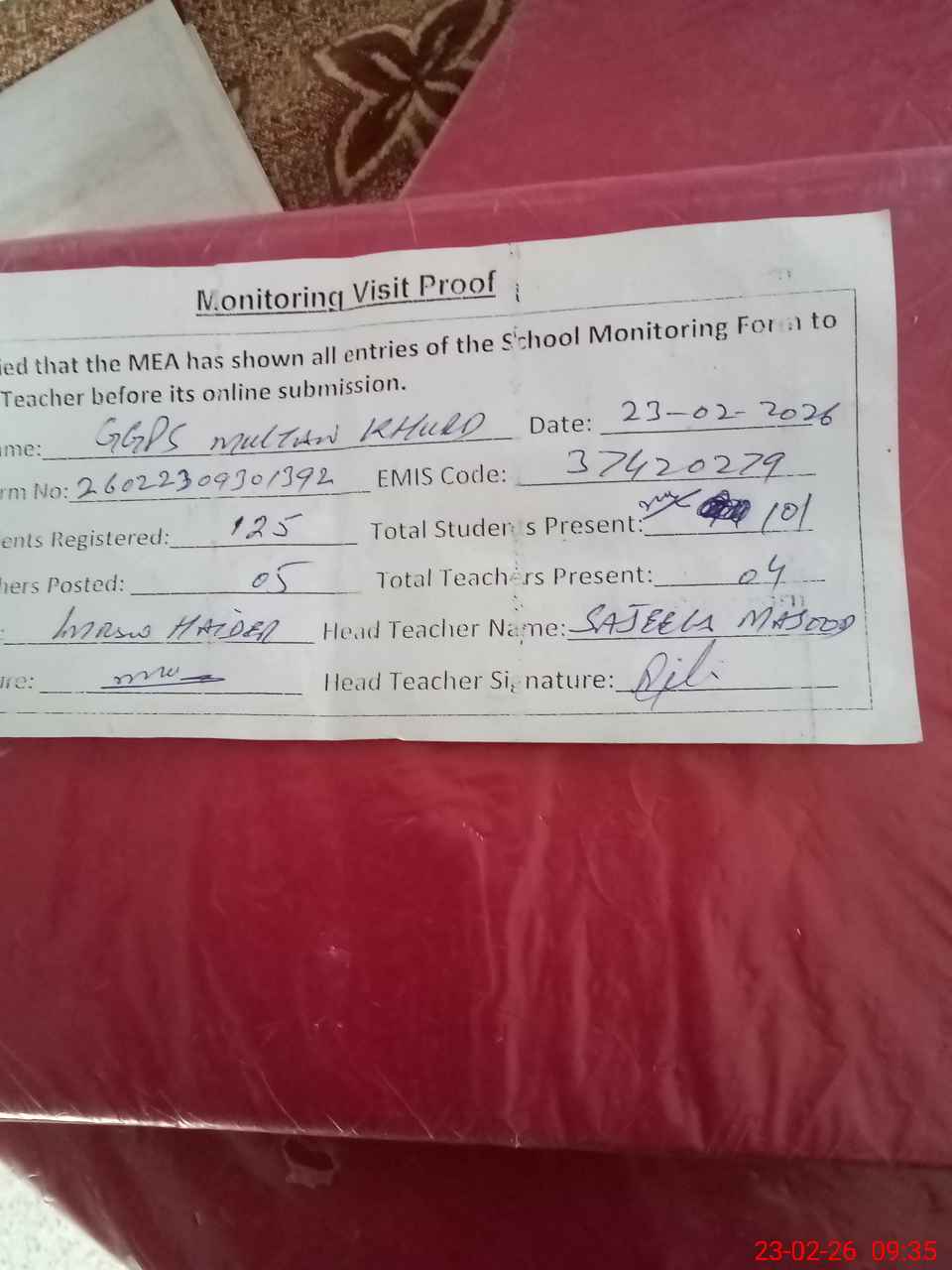 | Attendance Register | Head Teacher | MEA with School | Visit Proof |