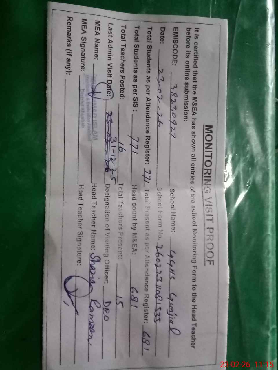 | Remarks (Use Separate Page if Required): DEO visited school on 31 December 2025 students strength on sis 771 | |||||
