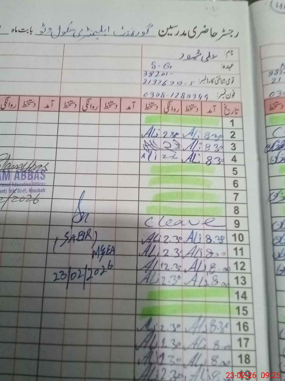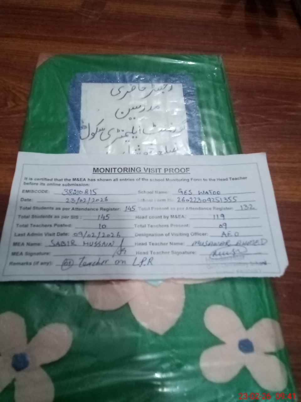 | Remarks (Use Separate Page if Required): no teacher absent total students on register 145 total students on SiS 145 last admin visit by AEO on 09 Feb 2026 | |||||