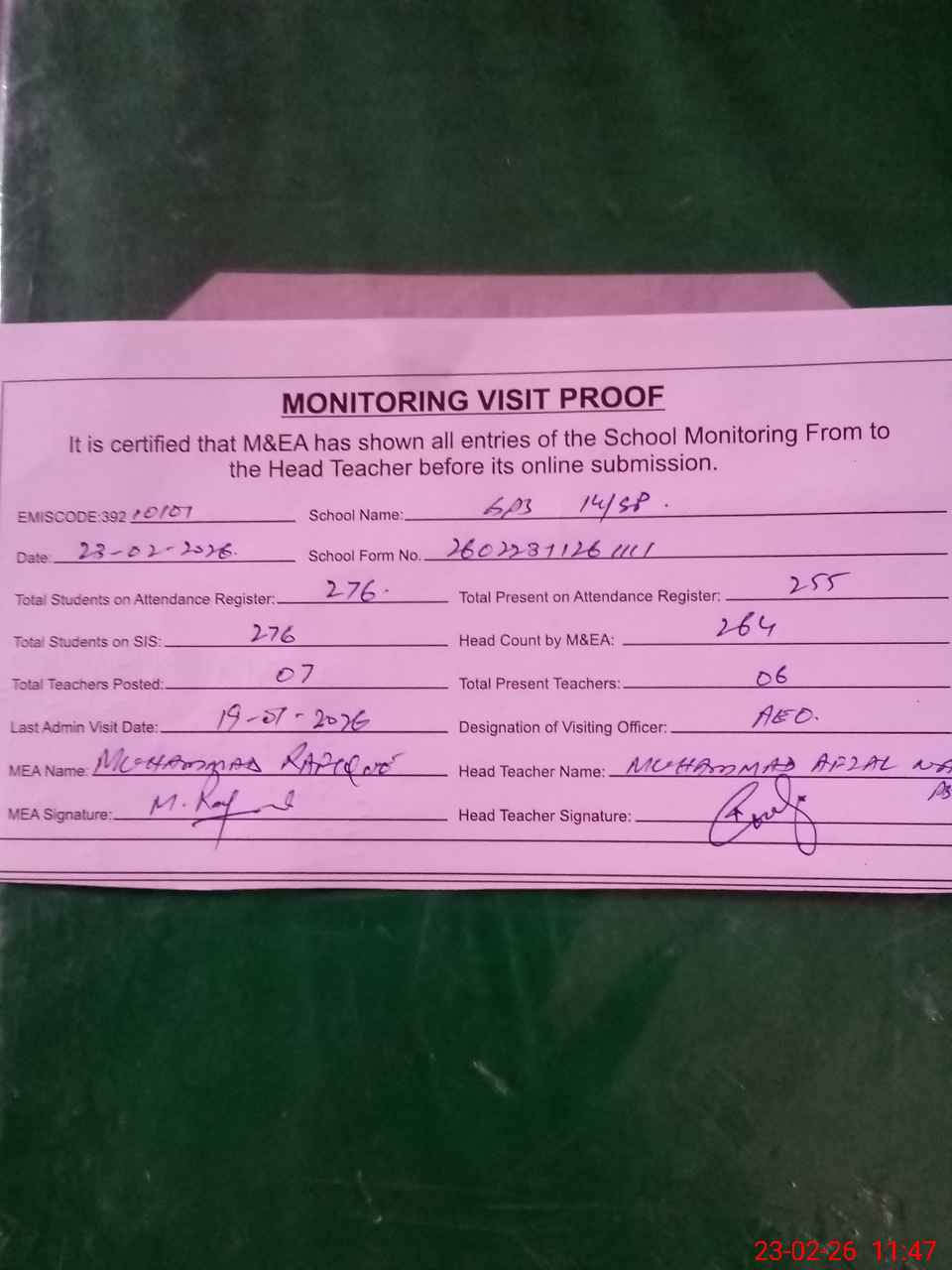 | EMIS Code: 39210101 | Name of School: GPS 14-SP P.O PAKPATTAN | |||