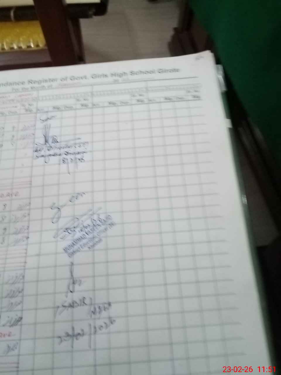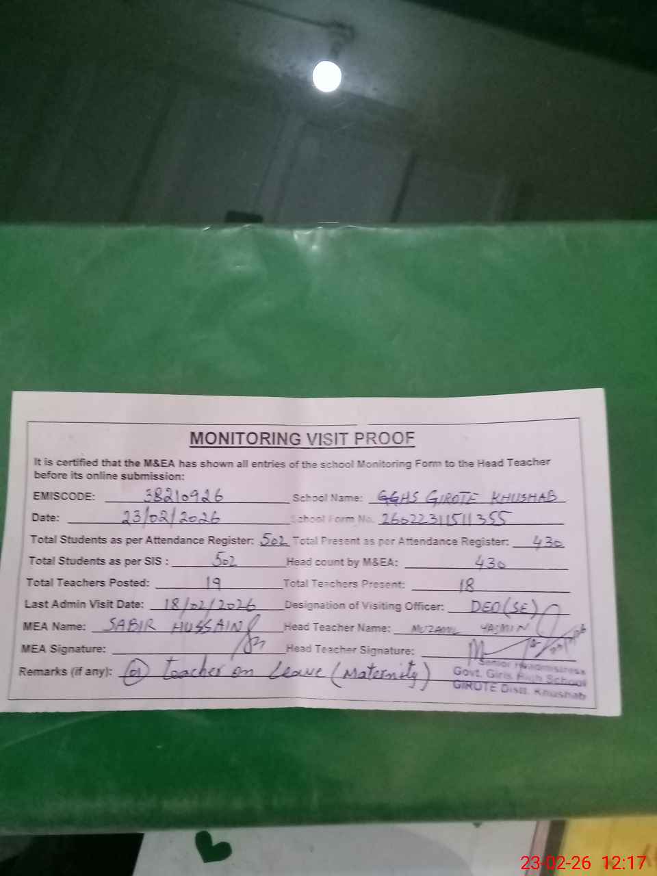 | Remarks (Use Separate Page if Required): no teacher absent total students on register 502 total students on SiS 502 last admin visit by DEO SE on 18 Feb 2026 | |||||