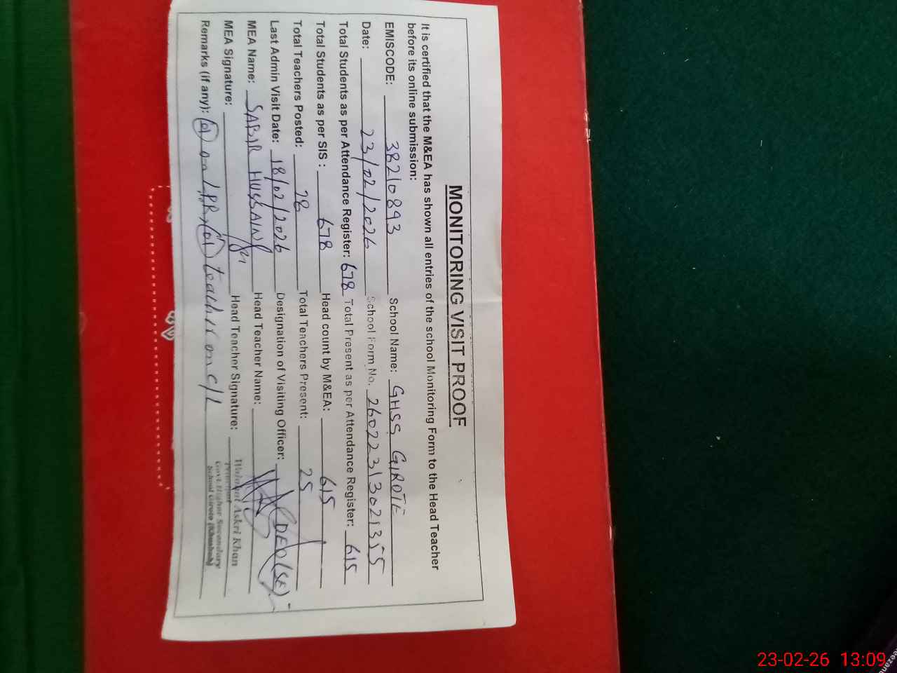 | Remarks (Use Separate Page if Required): no teacher absent total students on register 678 total students on SiS 678 last admin visit by DEO SE on 18 Feb 2026 | |||||