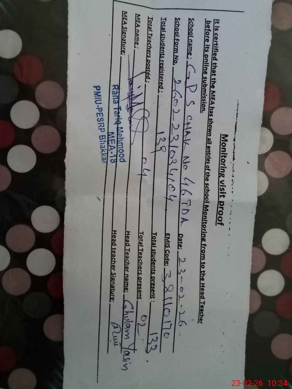 | EMIS Code: 38110170 | Name of School: GPS CHAK NO 46 TDA | |||