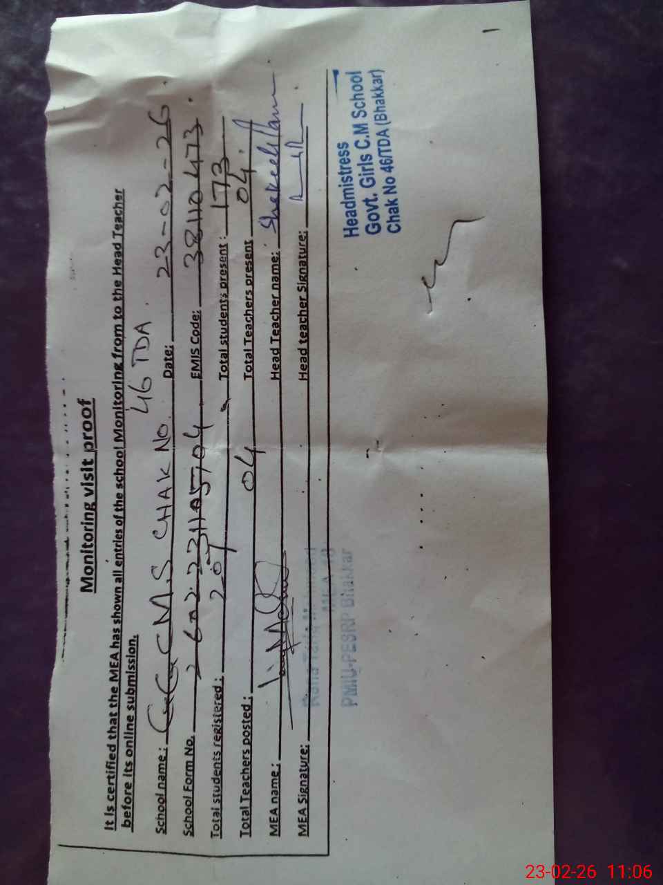 | EMIS Code: 38110473 | Name of School: GGCMS CHAK NO.46 TDA BHAKKAR | |||