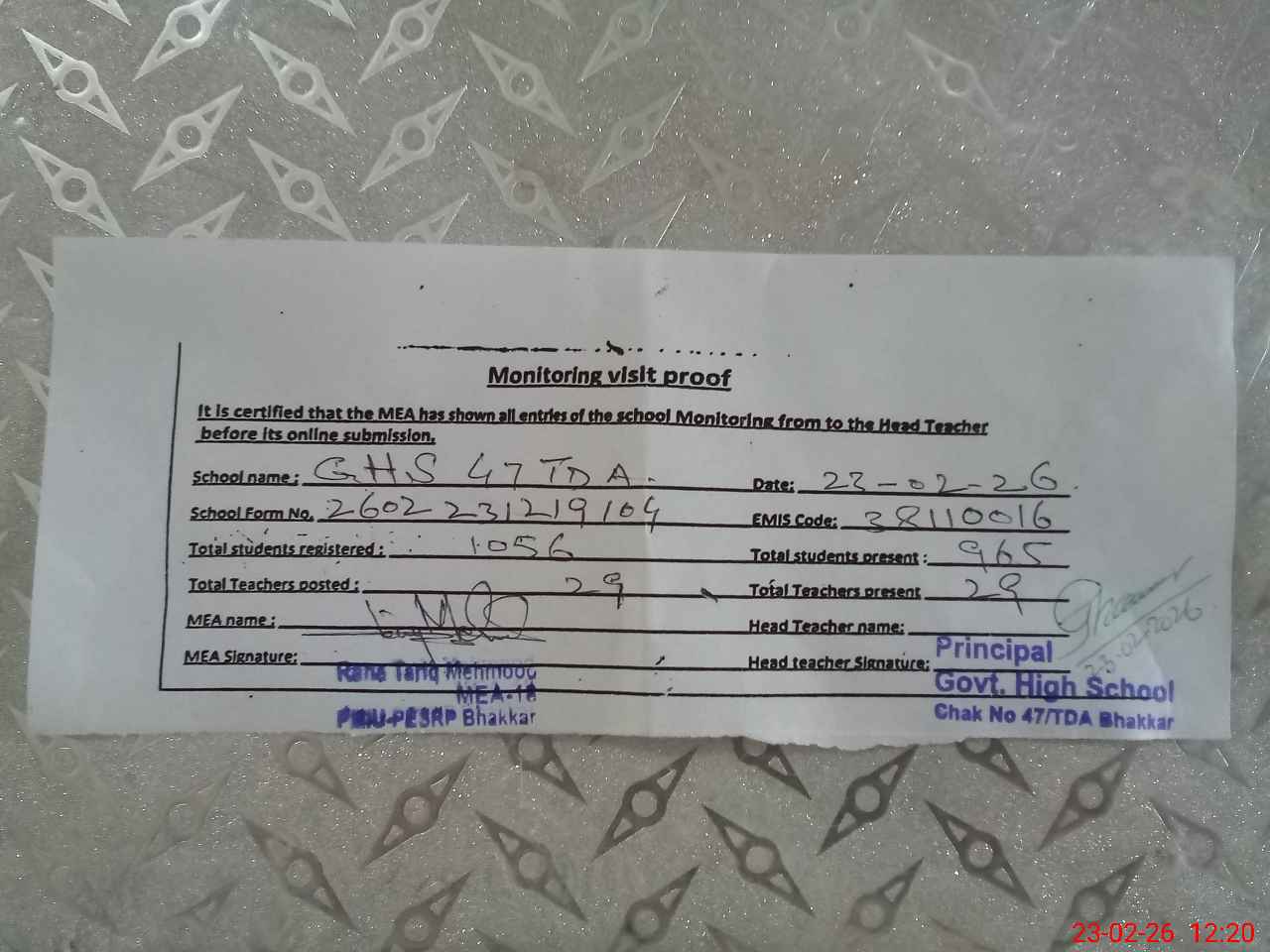 | EMIS Code: 38110016 | Name of School: GHS CHAK NO 47 TDA | |||
