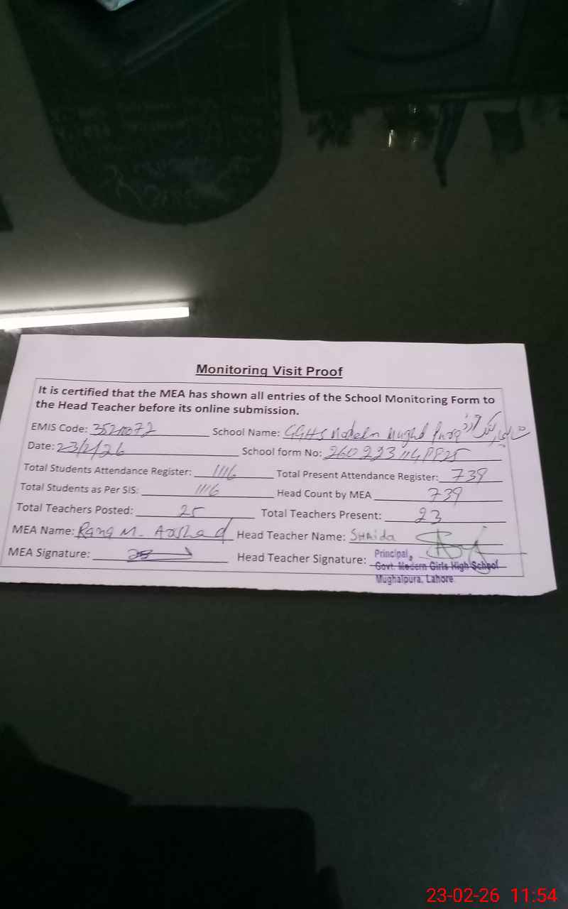 | EMIS Code: 35210072 | Name of School: GGHS MODERN MUGHALPURA, SHALIMAR LINK ROAD | |||