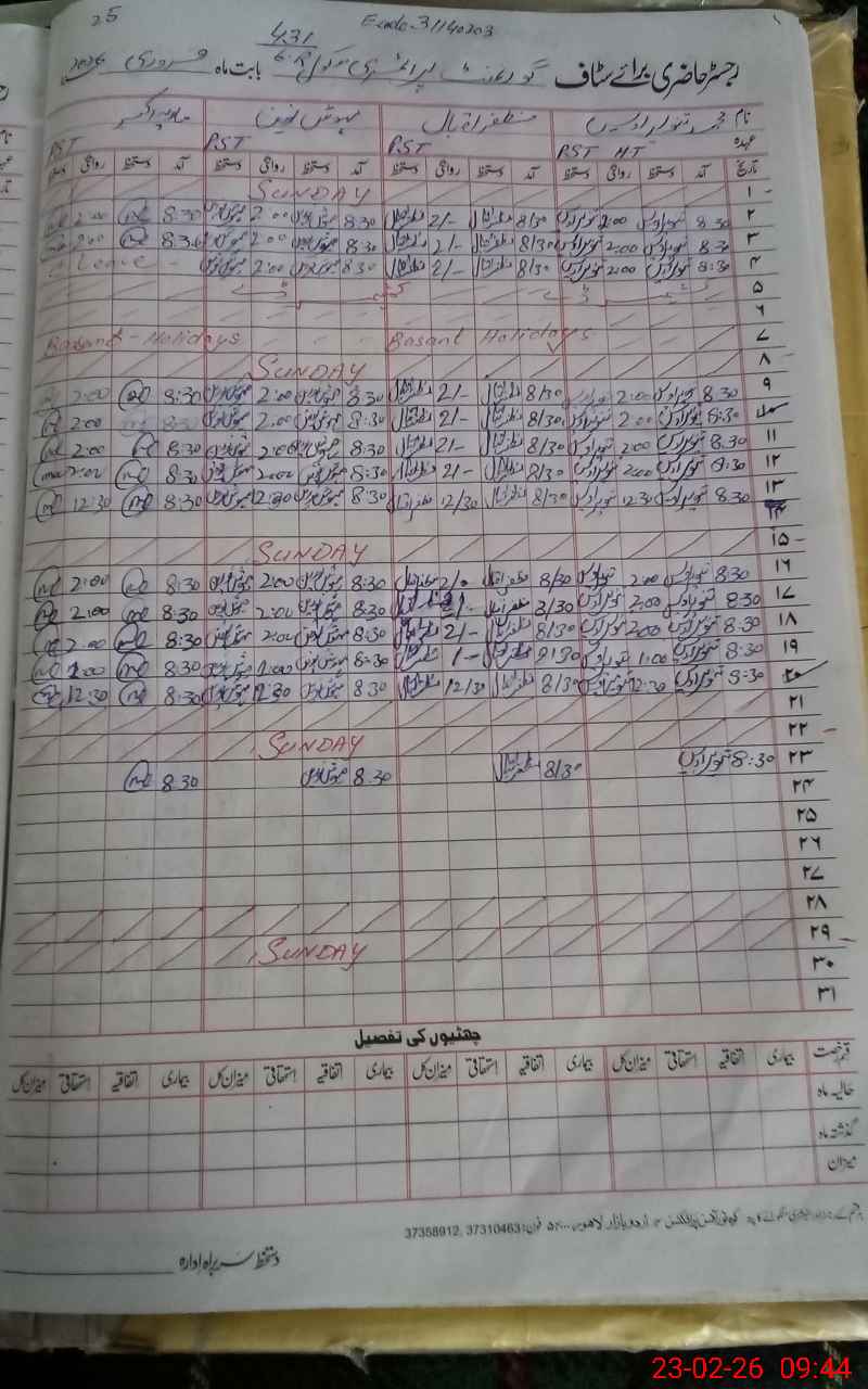 | CNIC | Full Name | Designation | R/C | Absence During Last Calender Month |