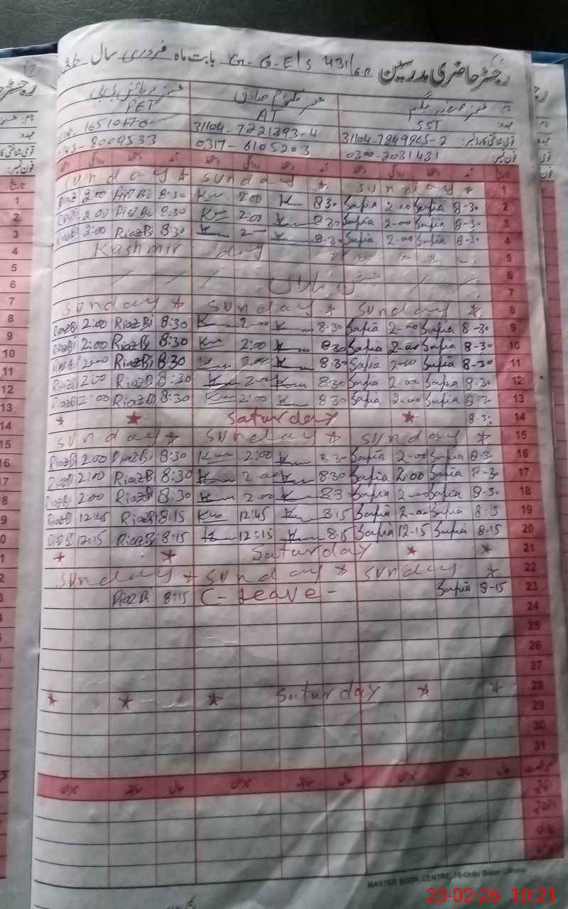 | 31**** | Sh**** No**** | PST Arts | Regular | 0 | 0 | 31 | 0 | 0 | 0 | 0 | 0 | 0 | Absent (Un-Authorized) |