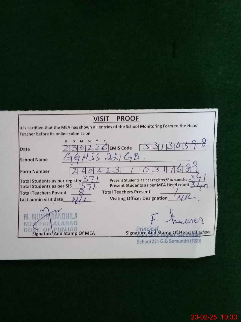 | EMIS Code: 33130398 | Name of School: GGHSS CHAK NO 221 GB | |||