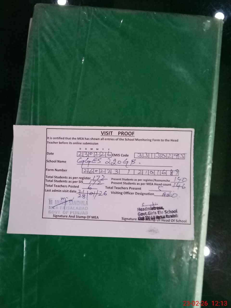 | EMIS Code: 33130295 | Name of School: GGES CHAK NO 220 GB | |||
