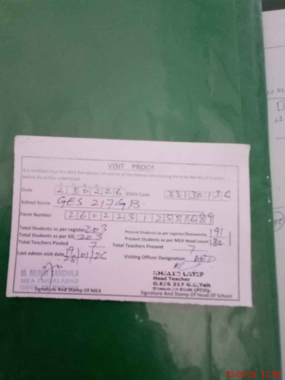 | Attendance Register | Head Teacher | MEA with School | Visit Proof |