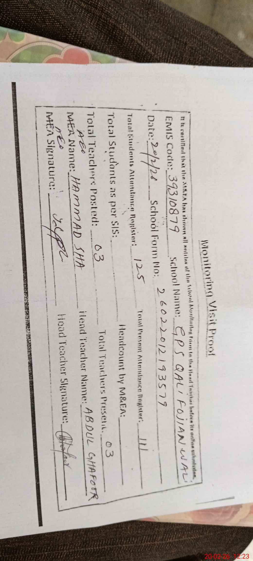 | Attendance Register | Head Teacher | MEA with School | Visit Proof |