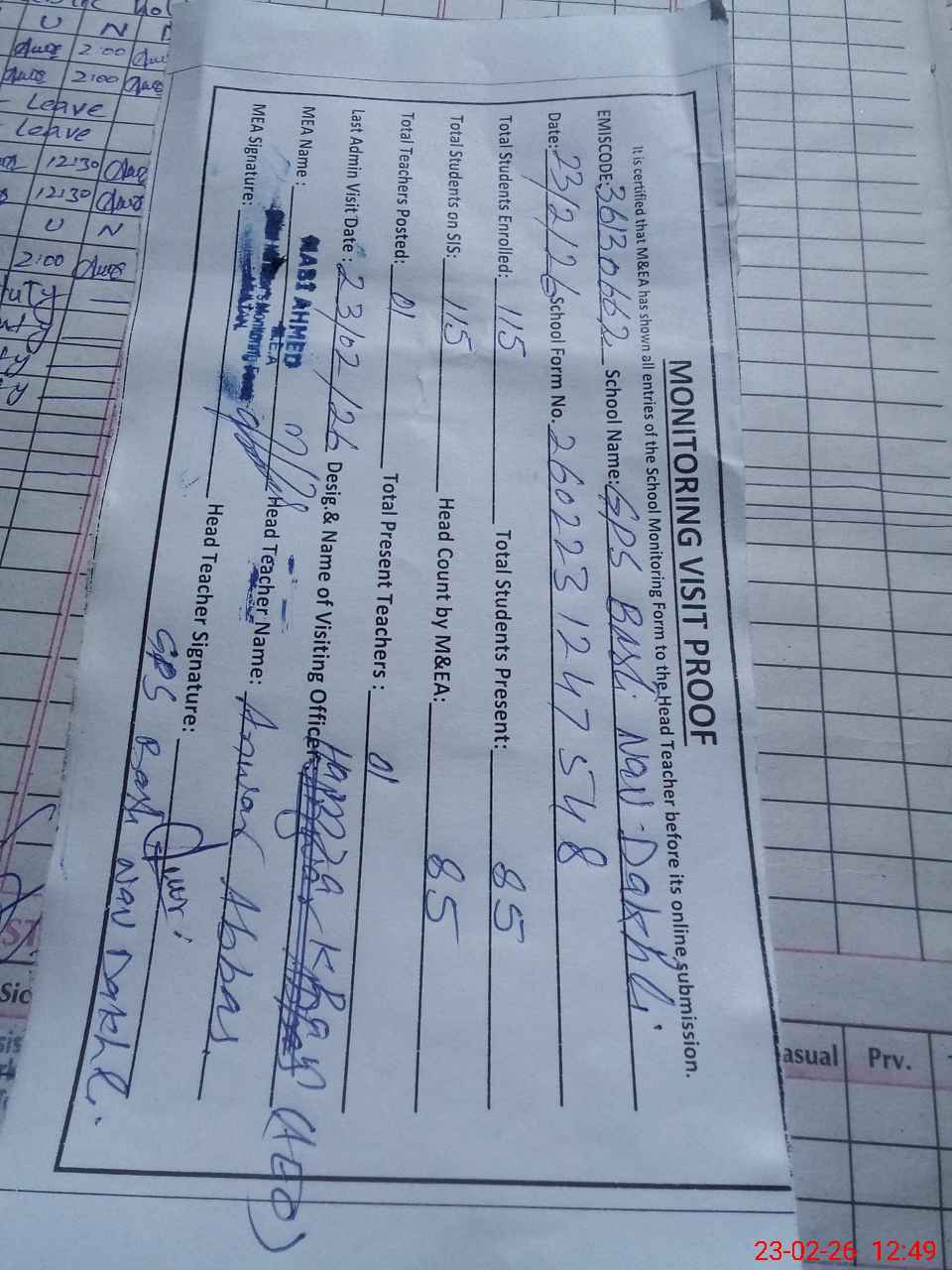 | Certified that this School was Inspected by the Undersigned MEA/DMO Today and the Information Stated Above is as Per Record. | |||||