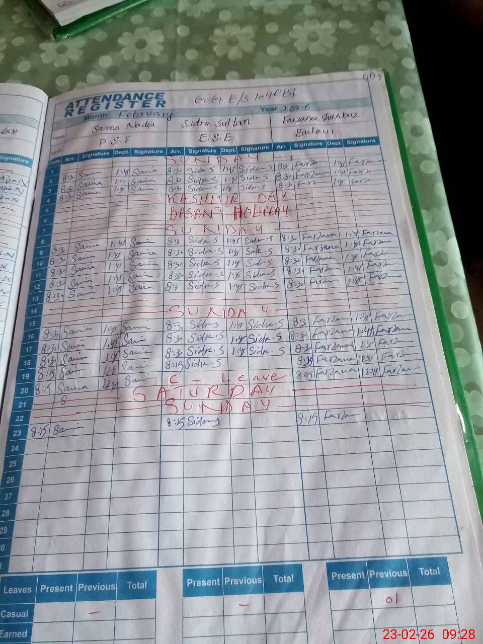 | Leave | Duty | Absent | Maternity | Medical | Ex- Pak |