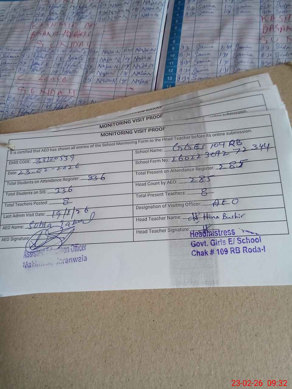 | Attendance Register | Head Teacher | MEA with School | Visit Proof |
