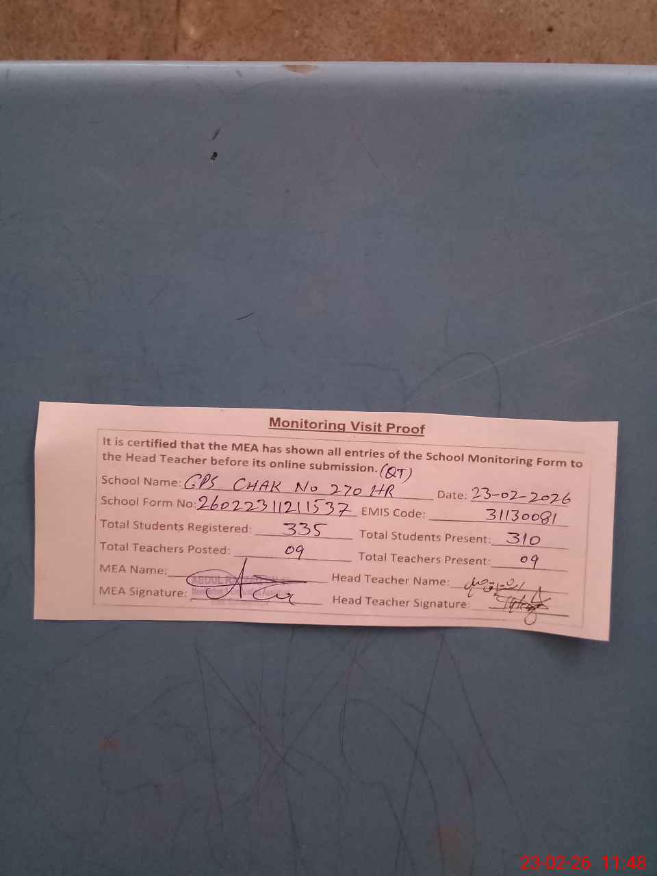 | Attendance Register | Head Teacher | MEA with School | Visit Proof |