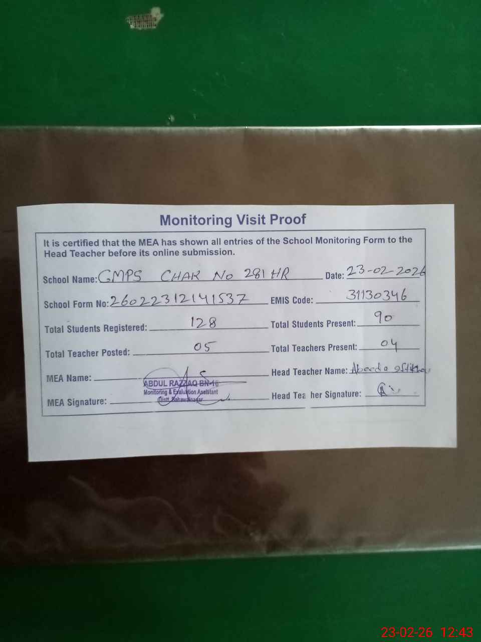 | EMIS Code: 31130346 | Name of School: GMPS CHAK NO 281 HR | |||