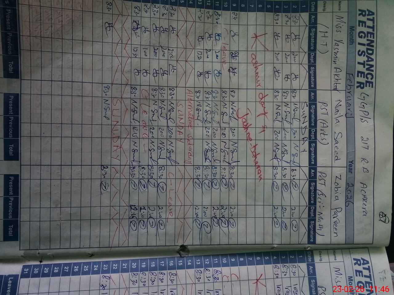 | CNIC | Full Name | Designation | R/C | Absence During Last Calender Month |