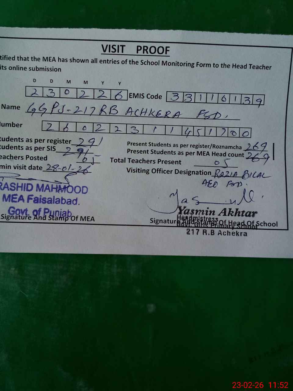 | Attendance Register | Head Teacher | MEA with School | Visit Proof |