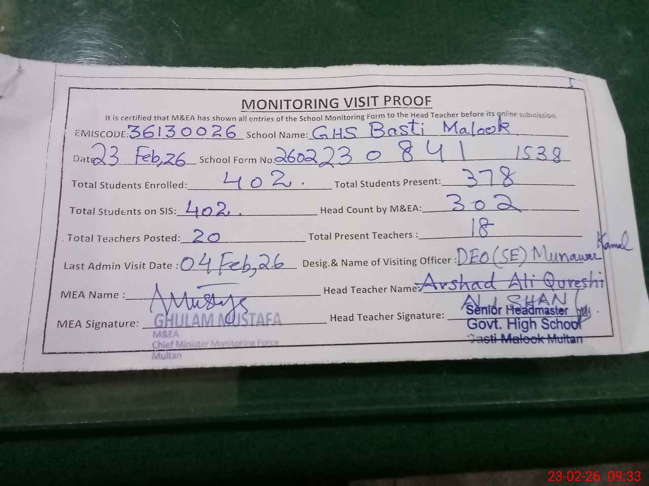 | Attendance Register | Head Teacher | MEA with School | Visit Proof |