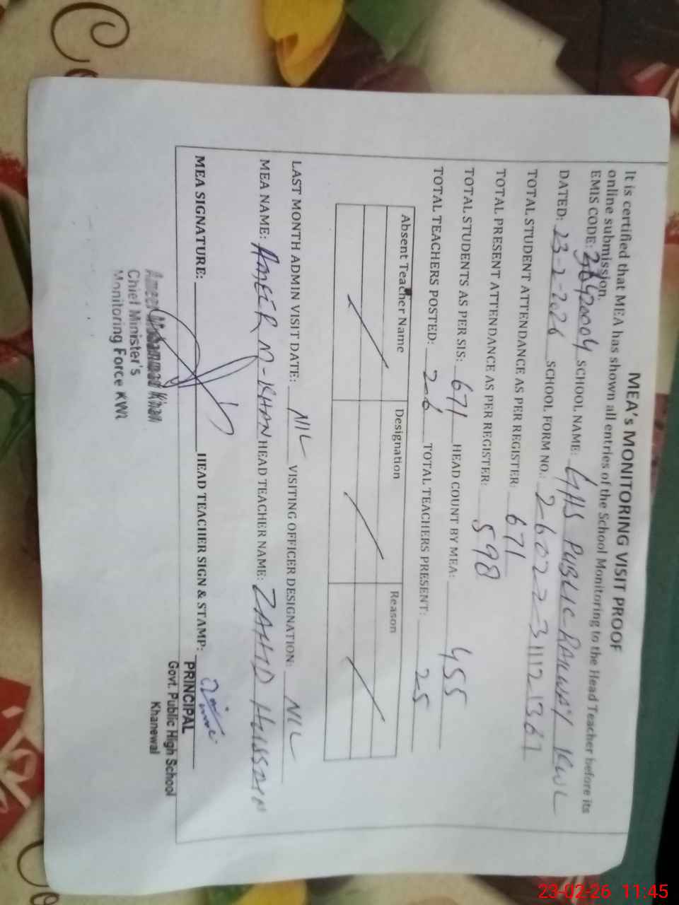 | Remarks (Use Separate Page if Required): online account not updated No official authority visit in previous month Students attandece list given on MEA tab not matching with school SIS | |||||