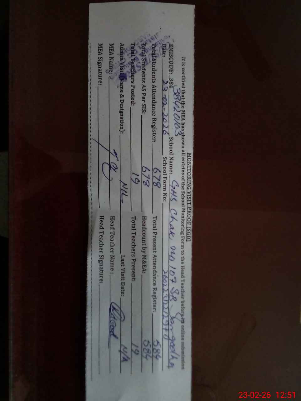 | Attendance Register | Head Teacher | MEA with School | Visit Proof |