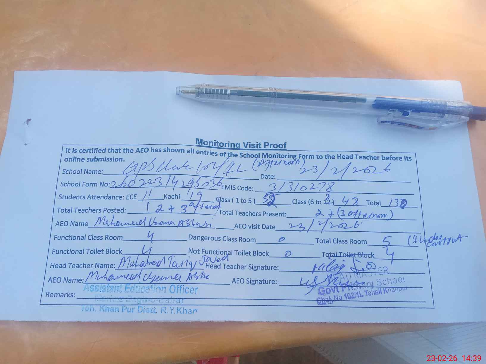 | EMIS Code: 31310278 | Name of School: GPS CHAK 102 1/L (After Noon) | |||