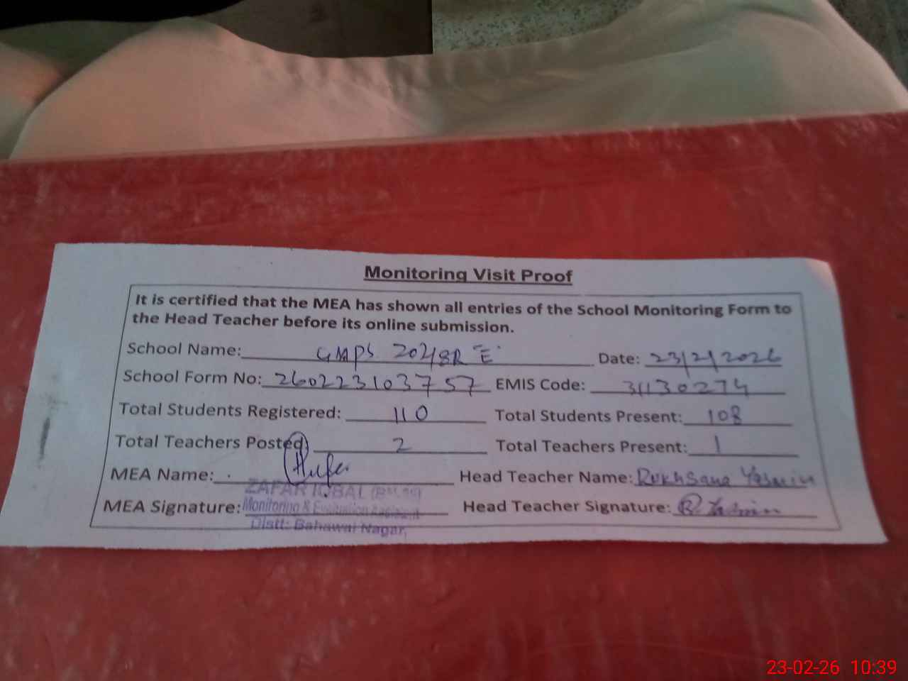 | Attendance Register | Head Teacher | MEA with School | Visit Proof |