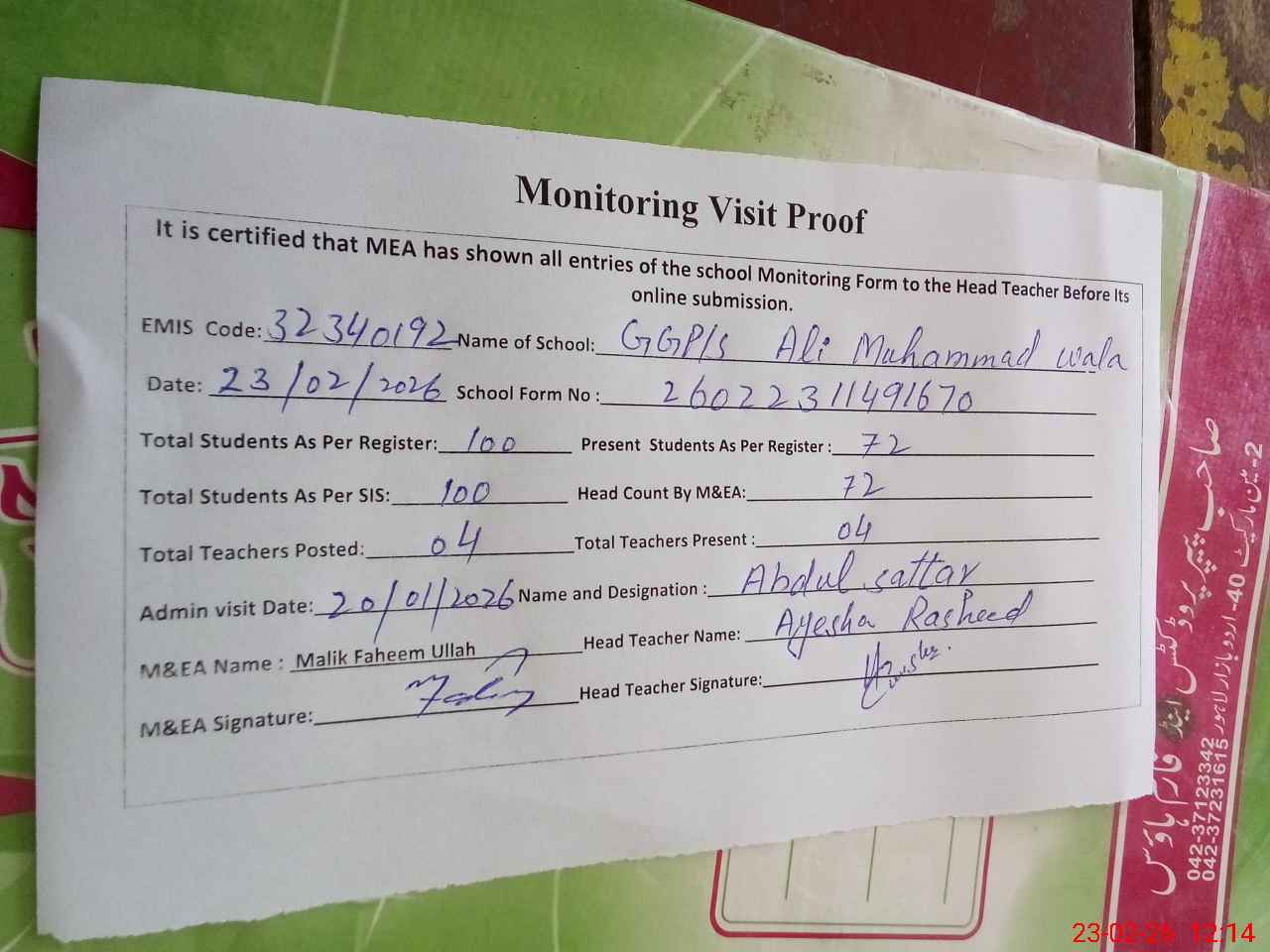 | EMIS Code: 32340192 | Name of School: GGPS ALI MUHAMMAD WALA | |||