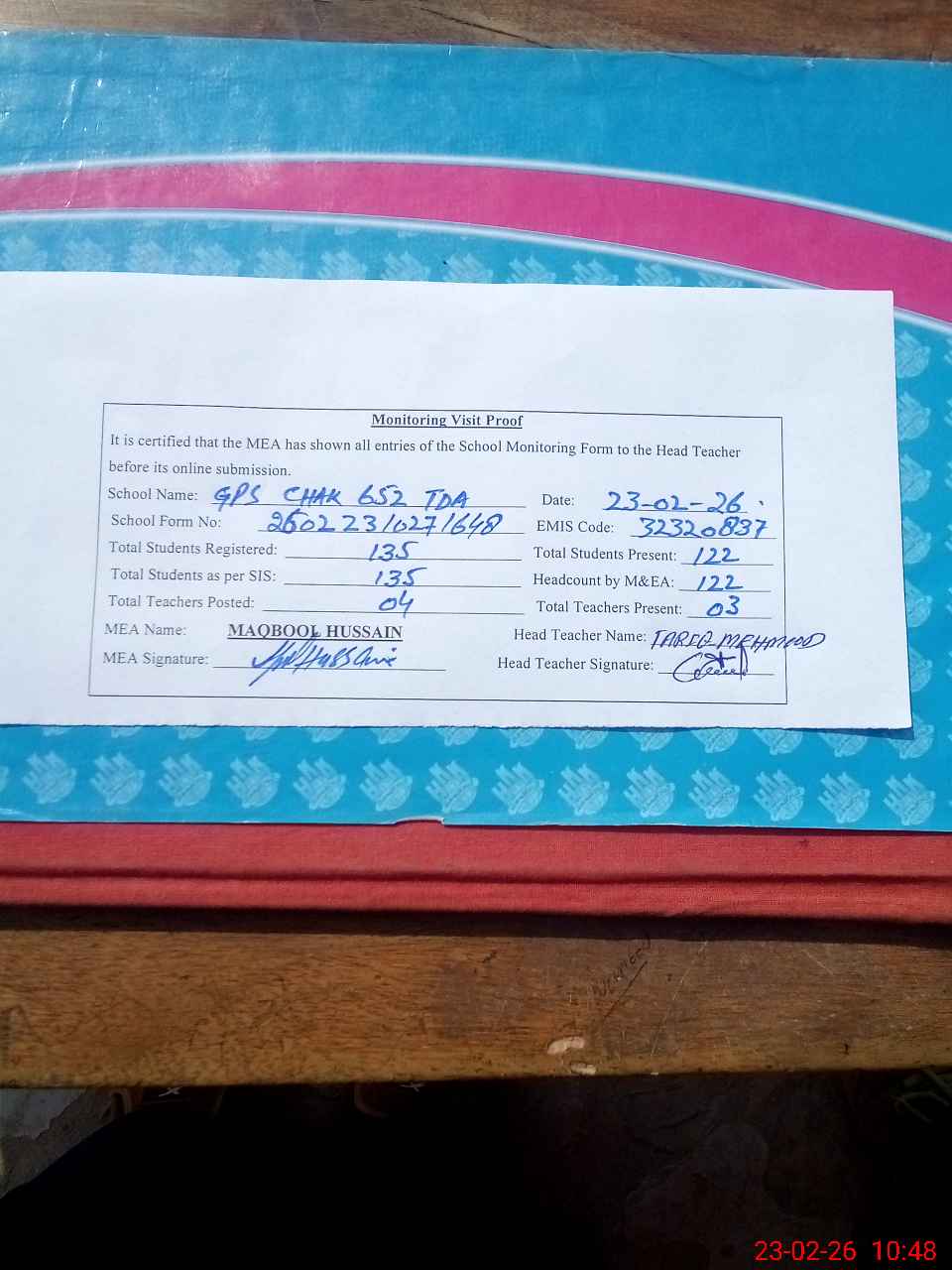 | EMIS Code: 32320837 | Name of School: GPS CHAK NO.652 TDA | |||