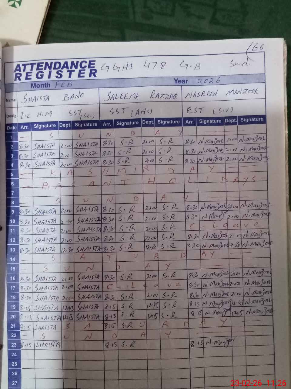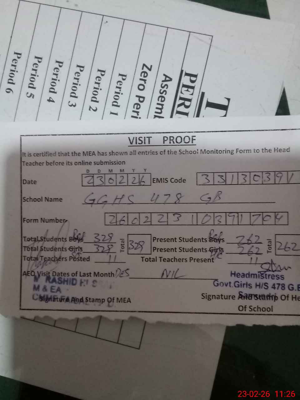 | Attendance Register | Head Teacher | MEA with School | Visit Proof |