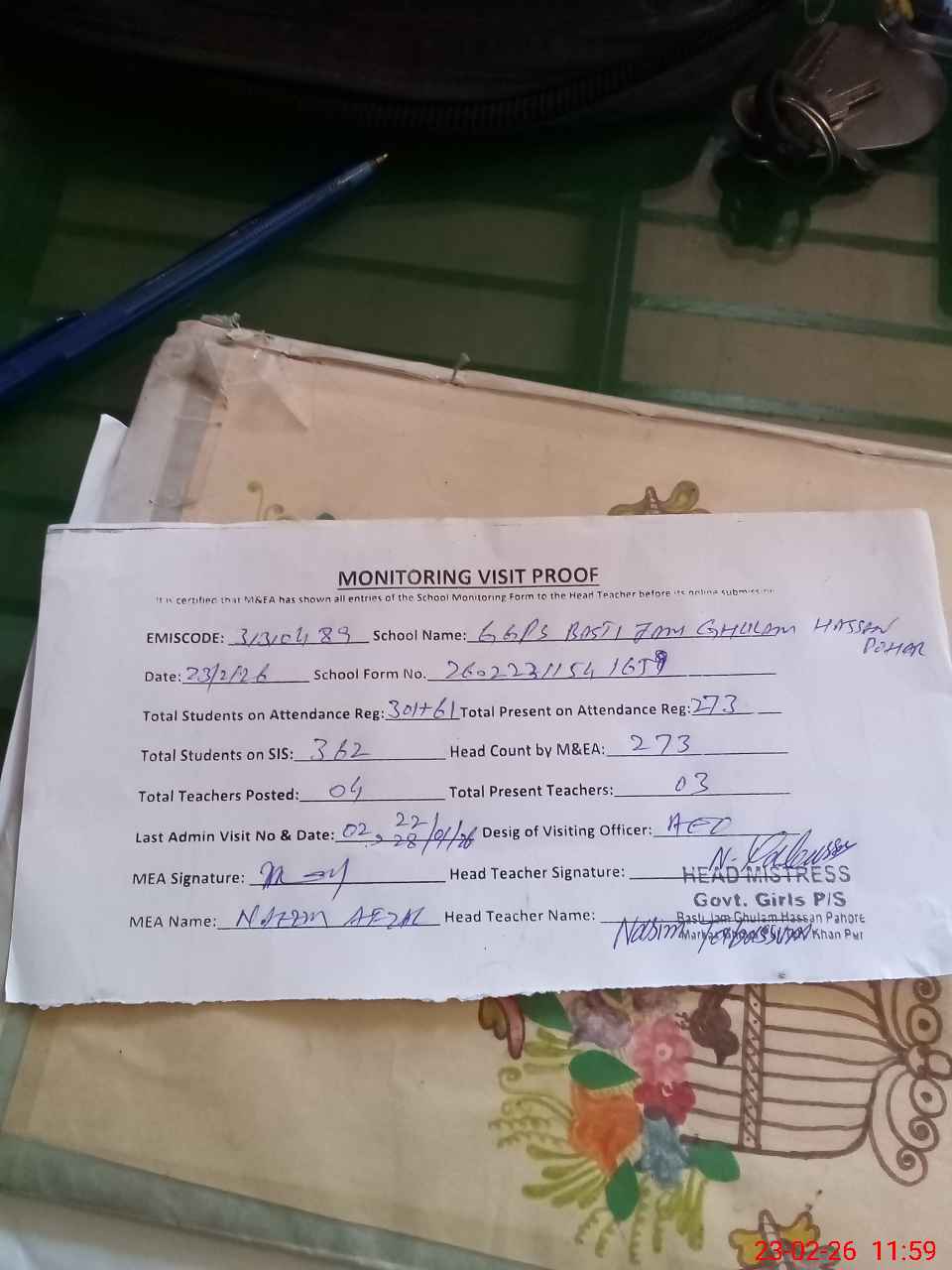 | Attendance Register | Head Teacher | MEA with School | Visit Proof |