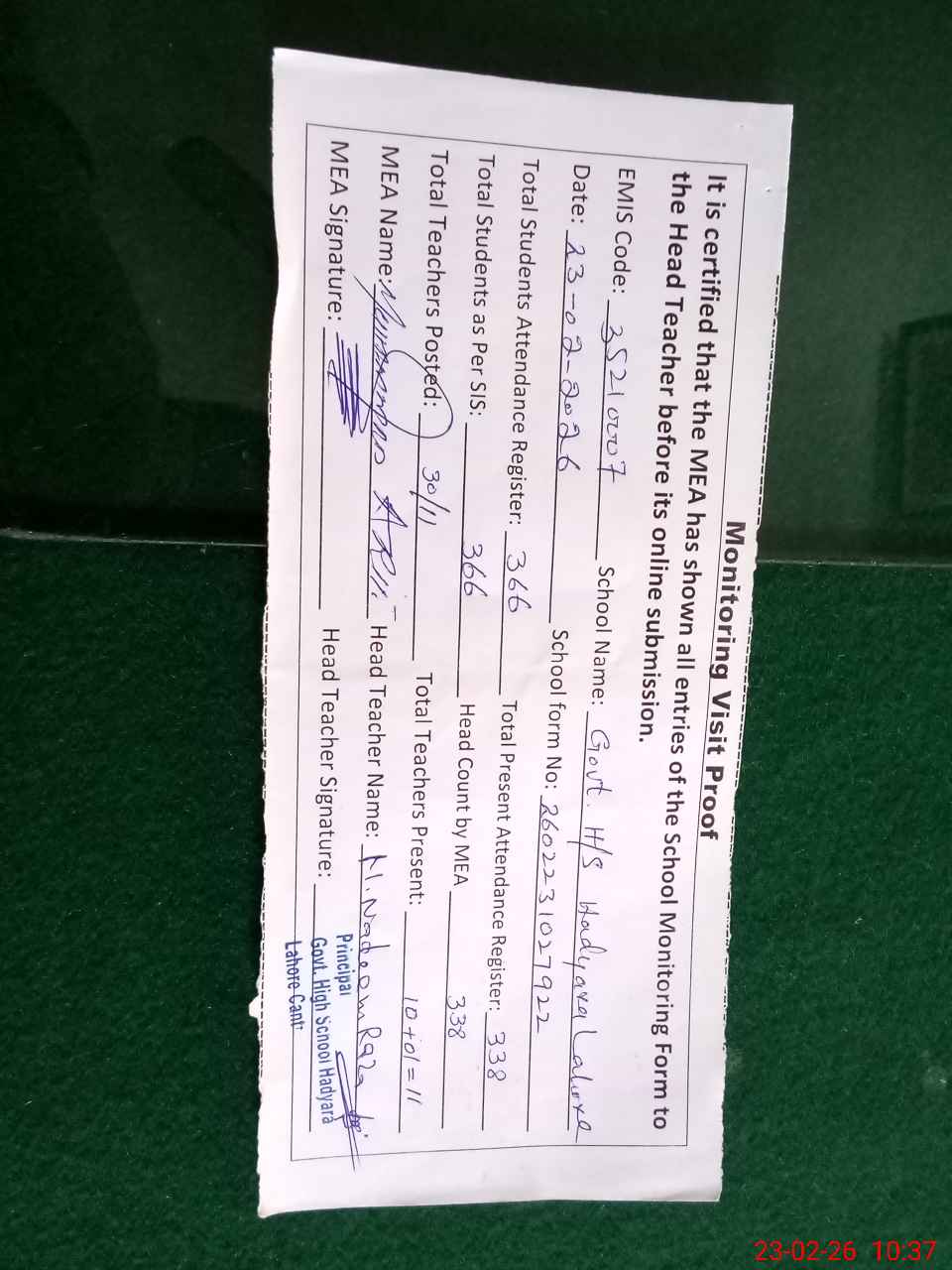 | Certified that this School was Inspected by the Undersigned MEA/DMO Today and the Information Stated Above is as Per Record. | |||||