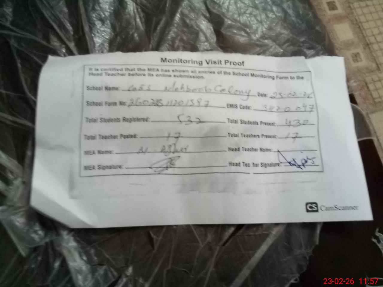 | Attendance Register | Head Teacher | MEA with School | Visit Proof |