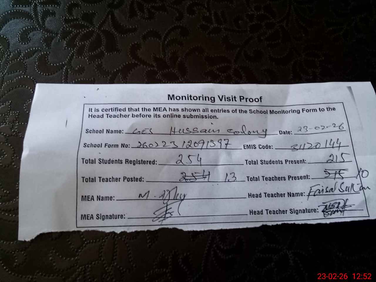 | Attendance Register | Head Teacher | MEA with School | Visit Proof |