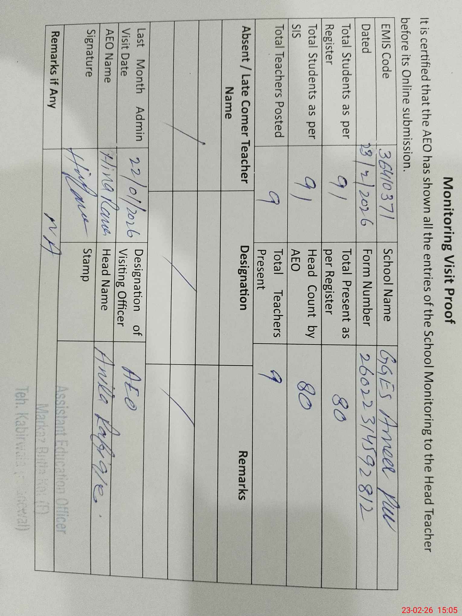 | EMIS Code: 36410371 | Name of School: GGES AMEER PUR, P/O NARHAL, KABIRWALA | |||