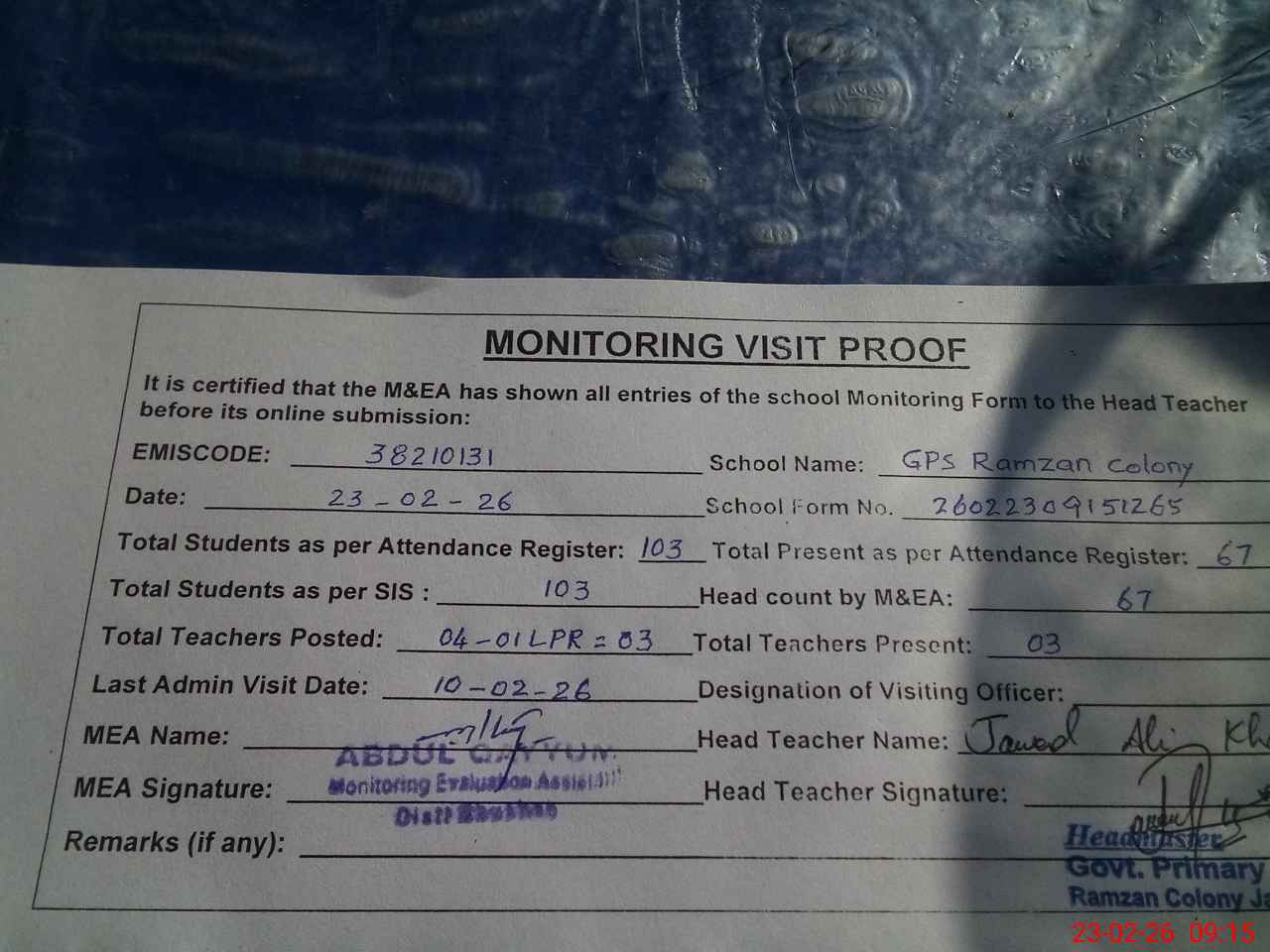 | Attendance Register | Head Teacher | MEA with School | Visit Proof |