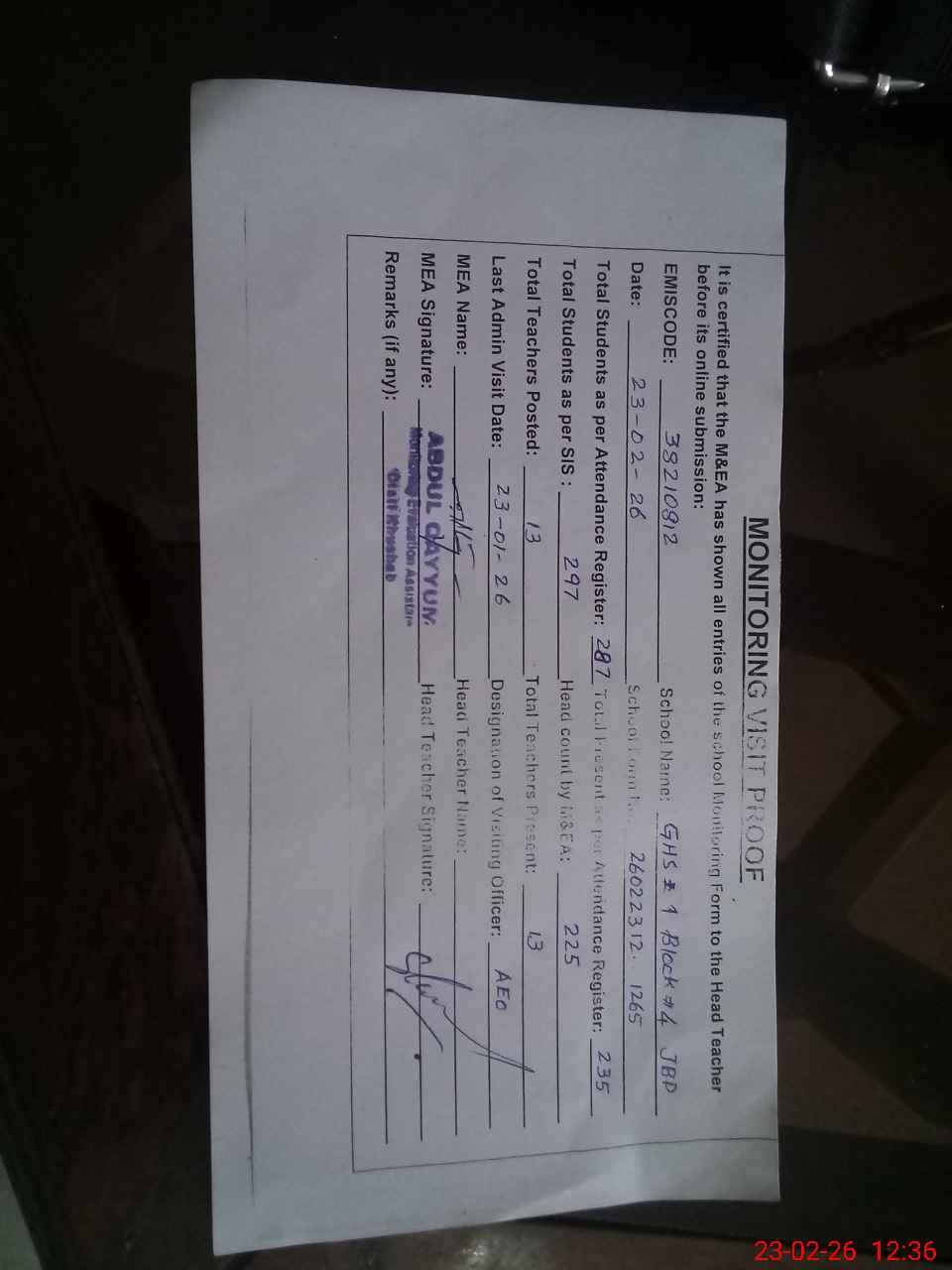 | Attendance Register | Head Teacher | MEA with School | Visit Proof |