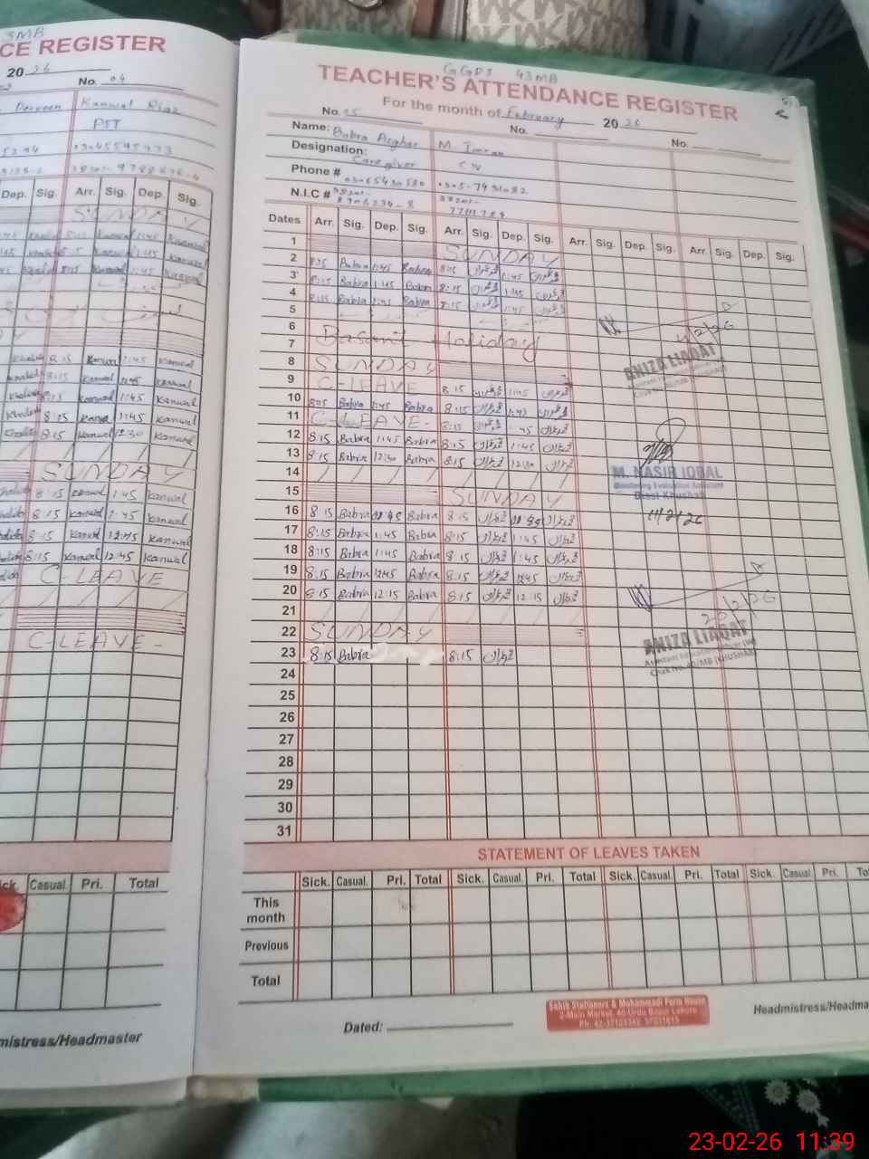 | Name: AF**** IL**** Designation: (School Headmaster's/Headmistress's) PST Phone/Cell Number: 03**** |