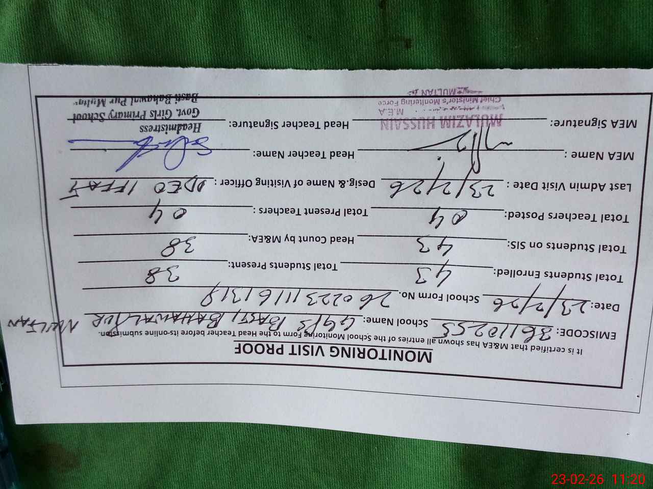 | Certified that this School was Inspected by the Undersigned MEA/DMO Today and the Information Stated Above is as Per Record. | |||||