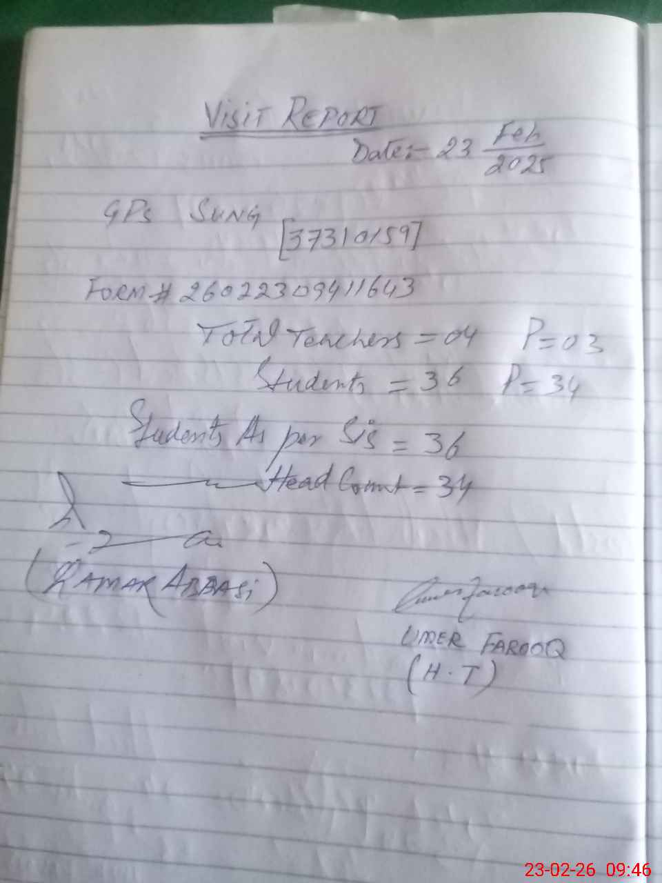 | Attendance Register | Head Teacher | MEA with School | Visit Proof |