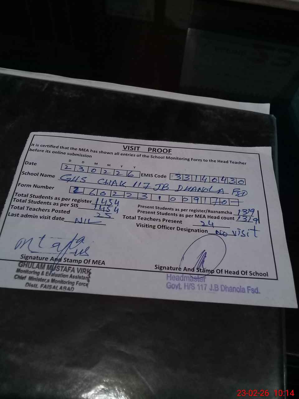 | EMIS Code: 33140430 | Name of School: GHS CHAK 117 JB DHANOLA FSD | |||